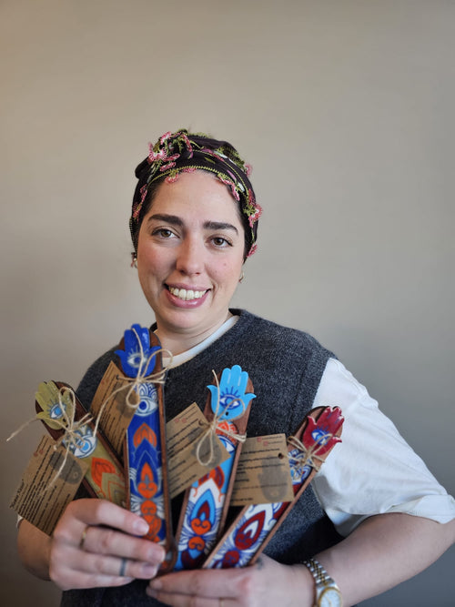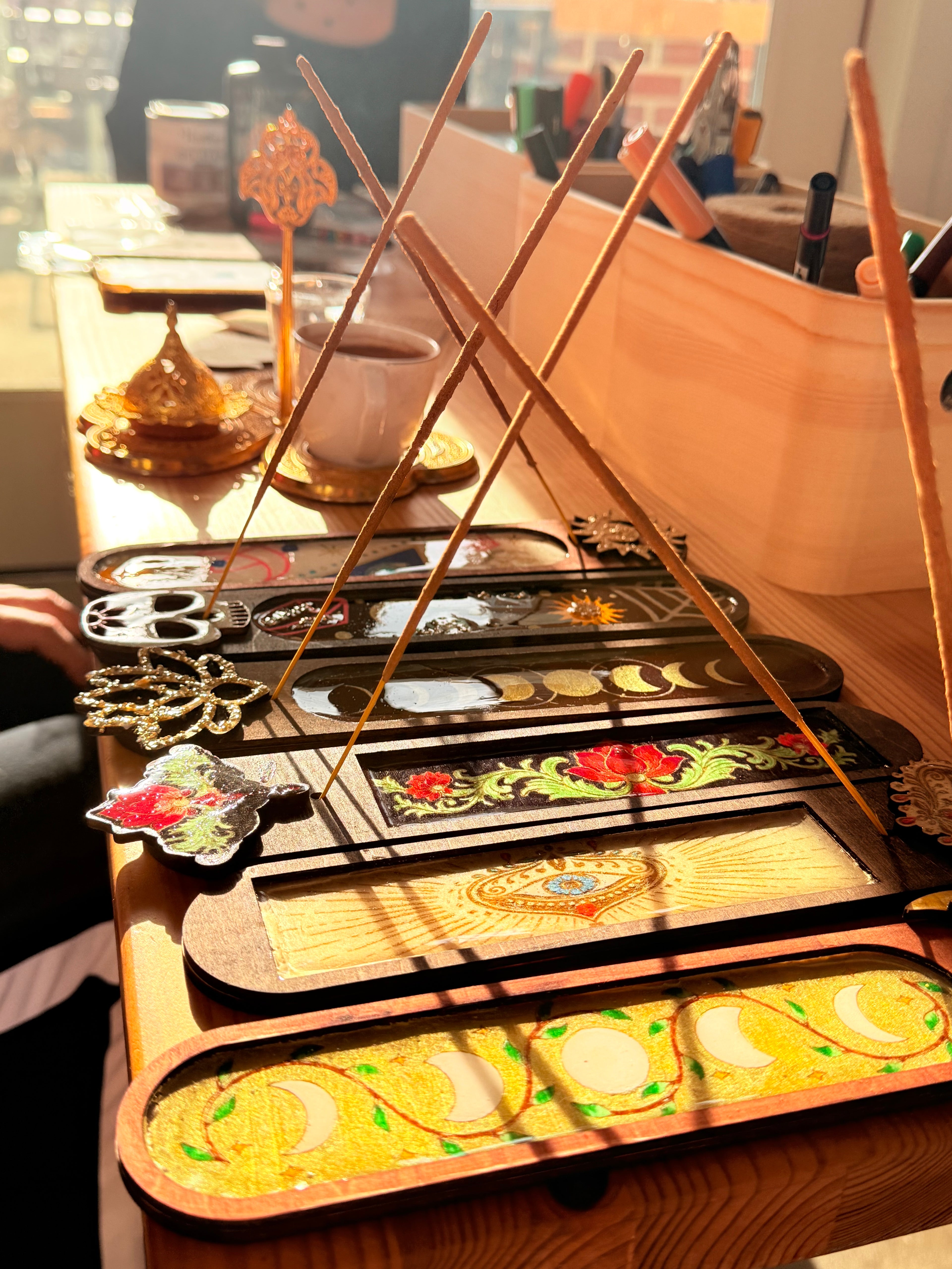 We painted, assembled, varnished, and finished Hamsa & Evil Eye incense holders with UV resin.